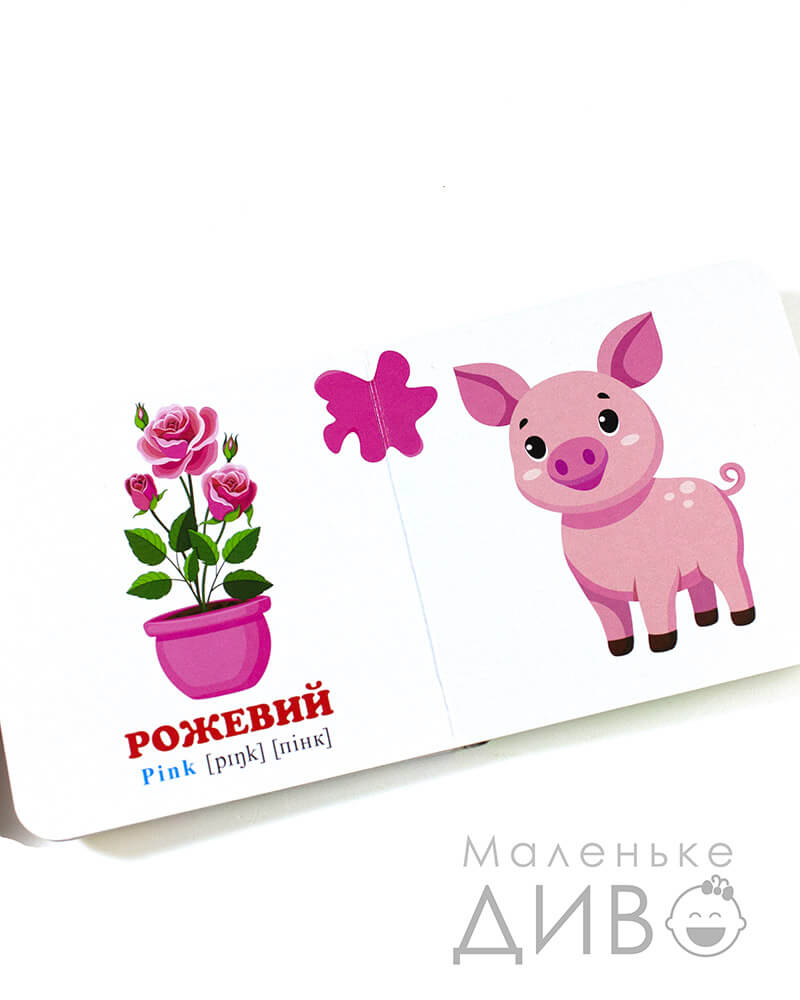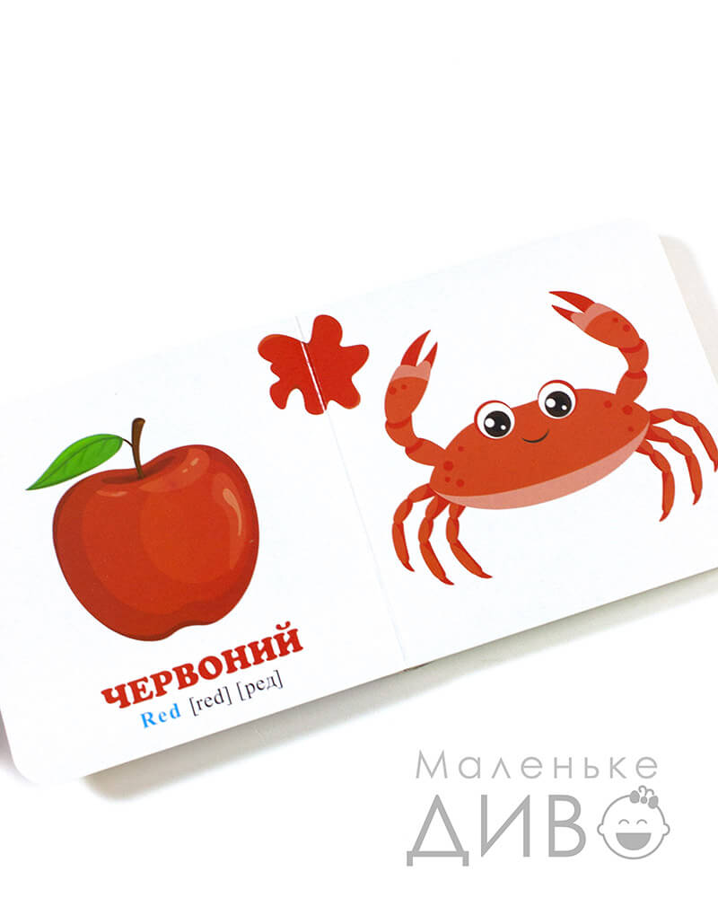- малюнки підписані великими червоними літерами українською мовою (+ є додатковий переклад англійською з транскрипцією)