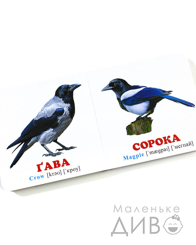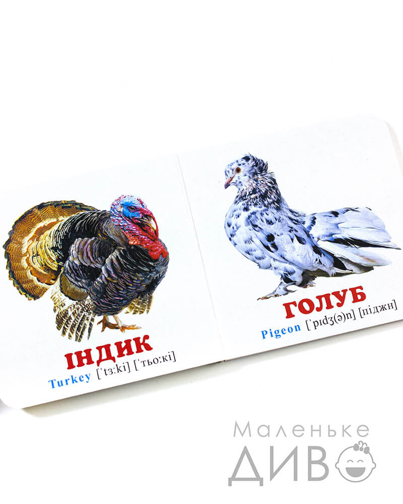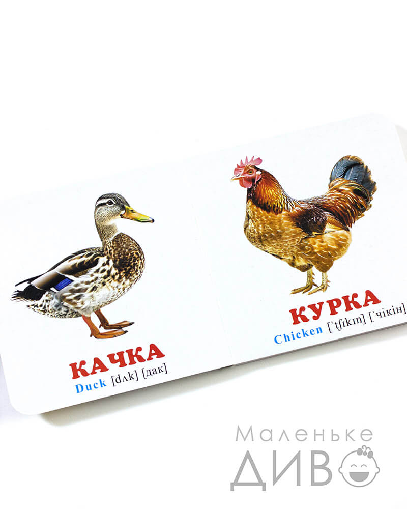 - малюнки підписані великими червоними літерами українською мовою (+ є додатковий переклад англійською з транскрипцією)