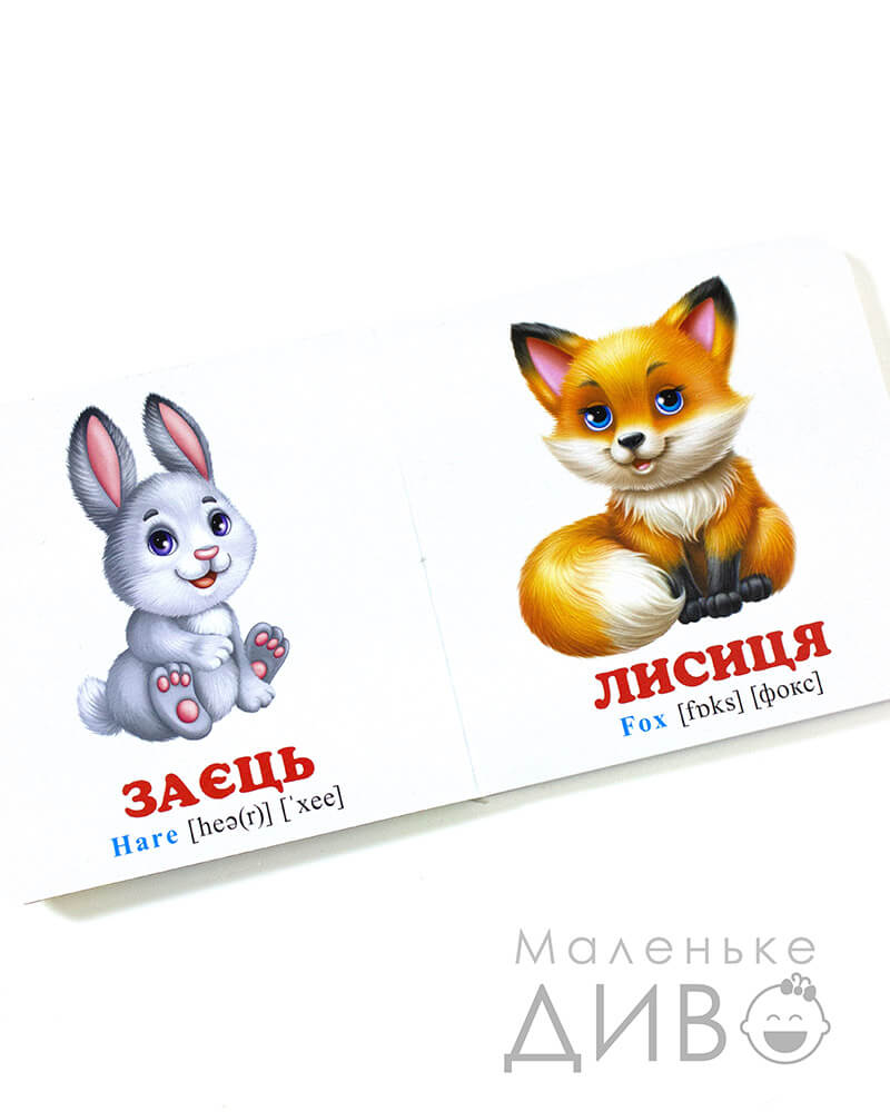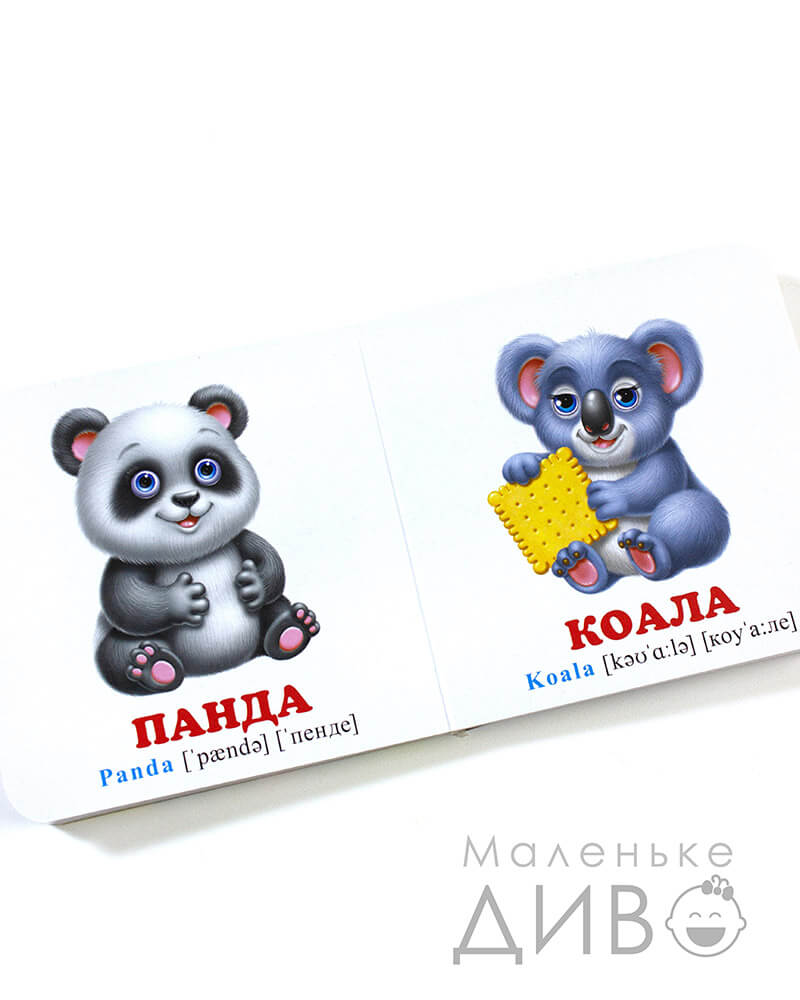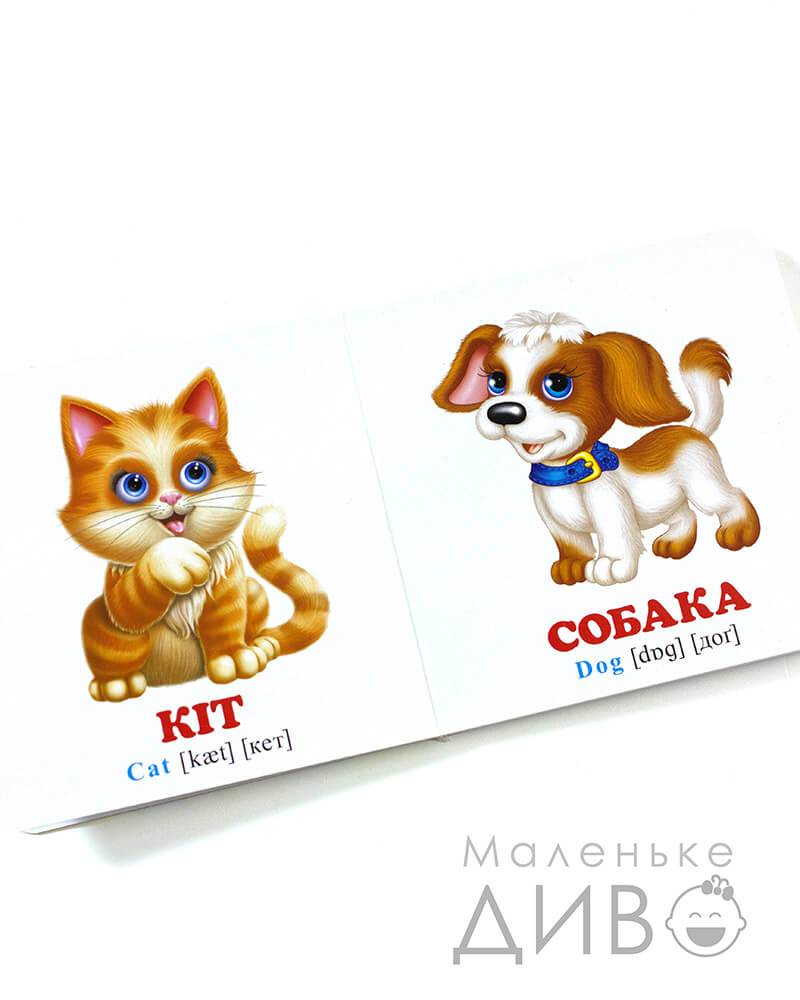 - малюнки підписані великими червоними літерами українською мовою (+ є додатковий переклад англійською з транскрипцією)