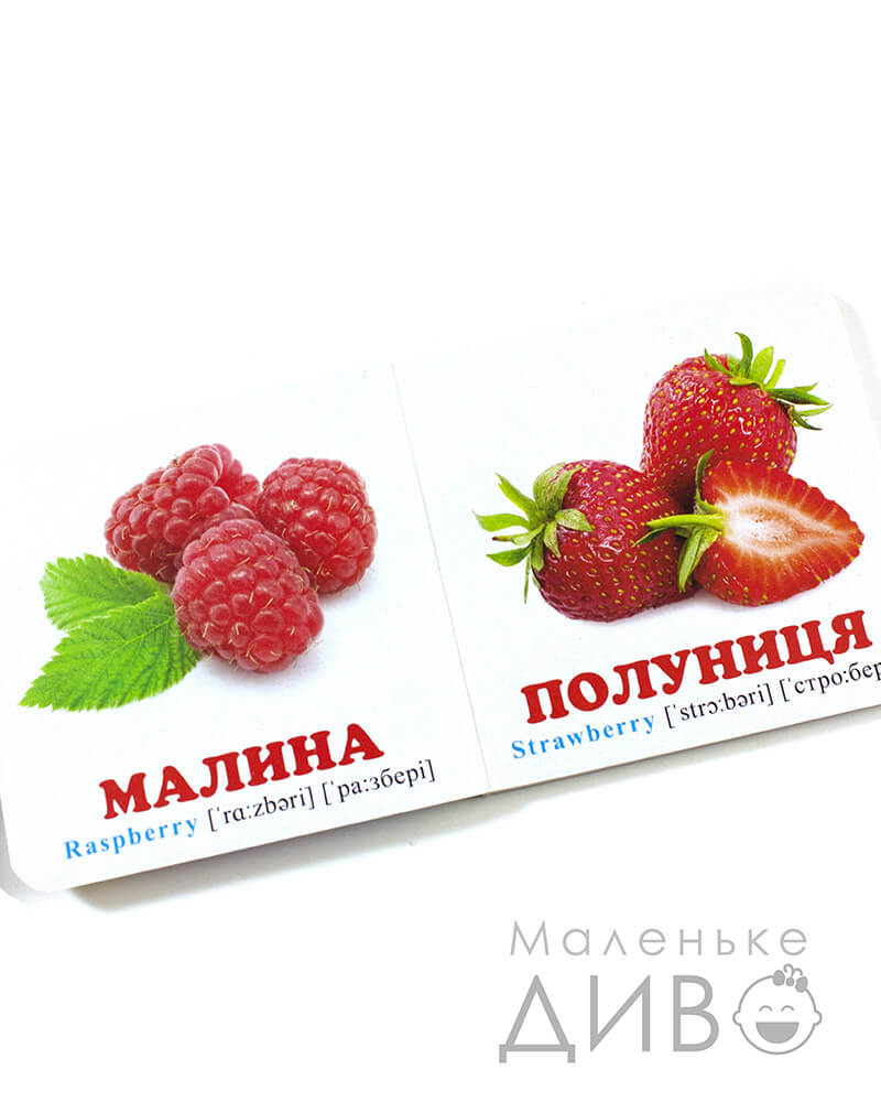 - малюнки підписані великими червоними літерами українською мовою (+ є додатковий переклад англійською з транскрипцією)