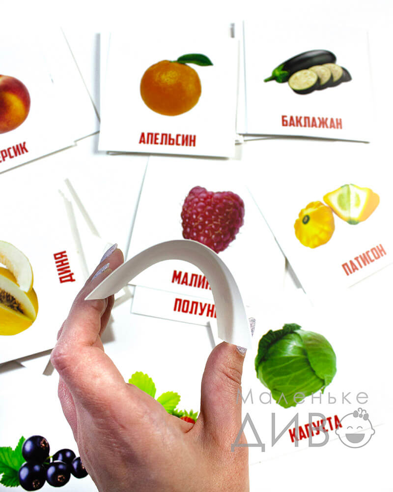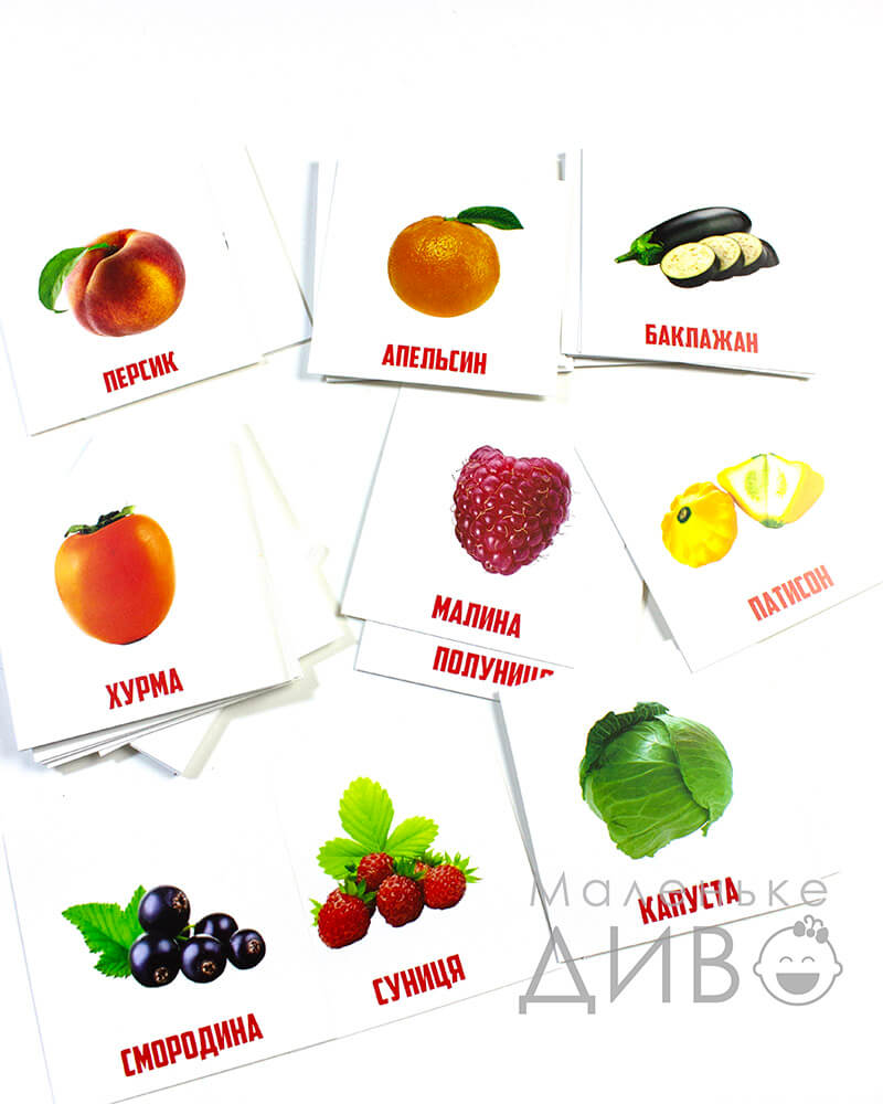 До комплекту входять картки: цибуля, морква, капуста, картопля, огірок, помідор, перець, буряк, часник, кукурудза, гарбуз, горох, редиска, кабачок, броколі, спаржа, патисон, петрушка, баклажан, ріпа, пастернак, квасоля, селера, редька, оливки, хрін, кольрабі, кріп, базилік, яблуко, кавун, банан, абрикос, вишня, апельсин, малина, ананас, лимон, мандарин, полуниця, чорниця, журавлина, виноград, груша, слива, персик, гранат, смородина, ожина, аґрус, манго, ківі, папайя, обліпиха, брусниця, лохина, грейпфрут, диня, інжир, авокадо, шовковиця, барбарис, калина, хурма, аронія, черешня, суниця, помело, лайм, фініки.