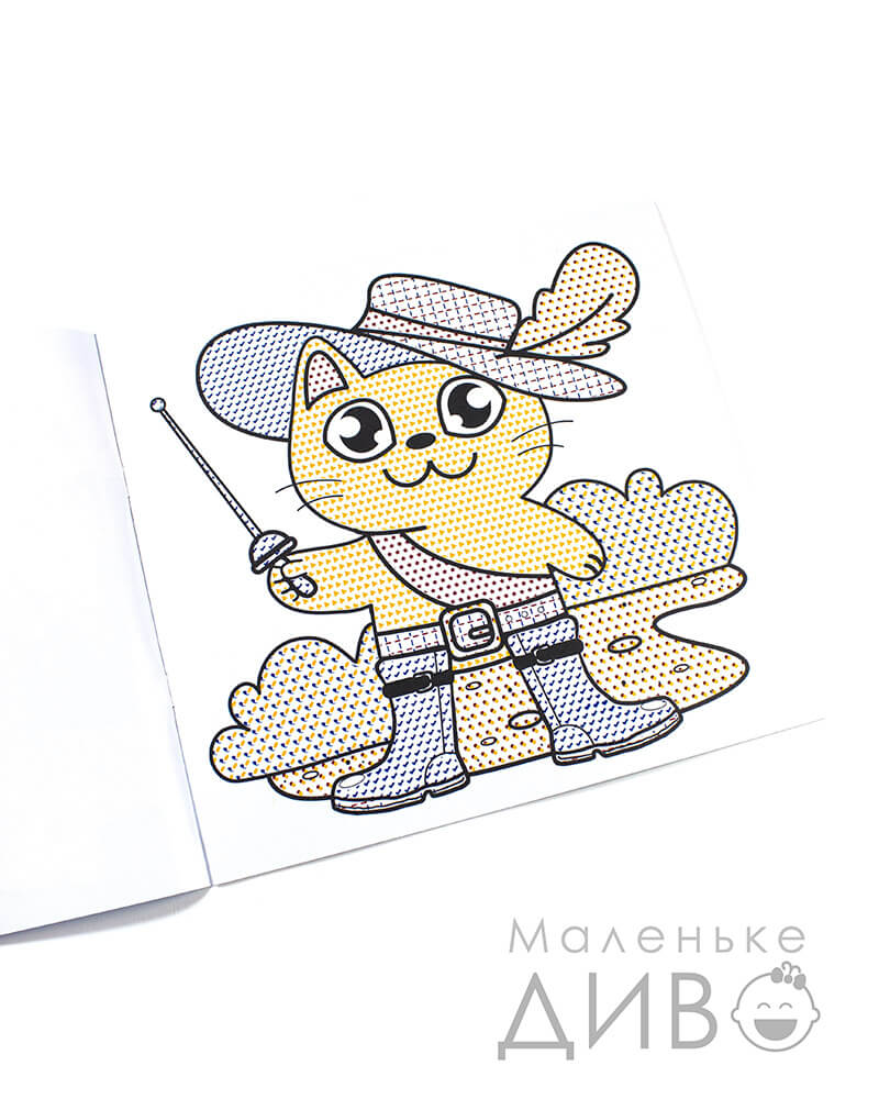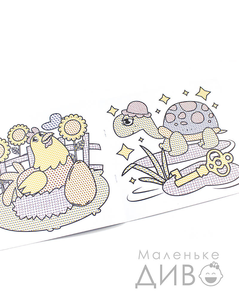 В цих розмальовках з однієї сторони аркуша нанесений малюнок з водною розмальовкою (на папір нанесені крапки з фарбою, які під дією води перетворять картинку на кольорову), інша сторона аркуша пуста (щоб наступний малюнок не ромивався водою з попереднього)