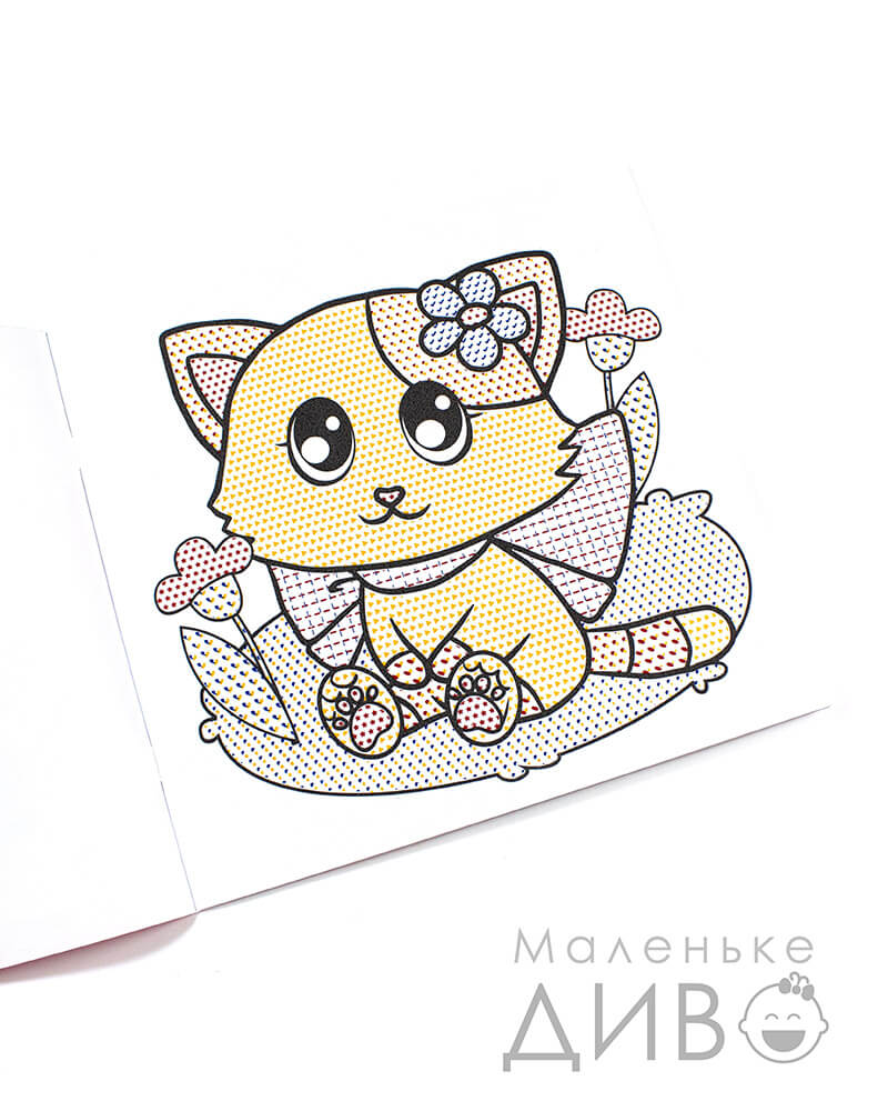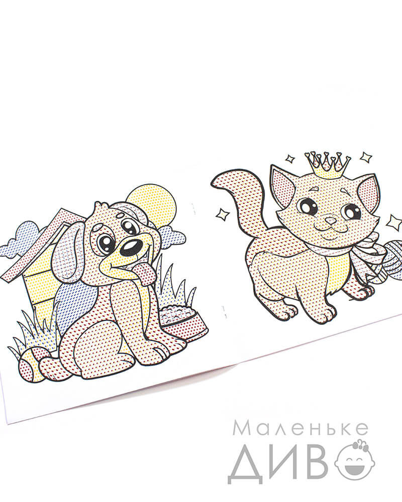 В цих розмальовках з однієї сторони аркуша нанесений малюнок з водною розмальовкою (на папір нанесені крапки з фарбою, які під дією води перетворять картинку на кольорову), інша сторона аркуша пуста (щоб наступний малюнок не ромивався водою з попереднього)