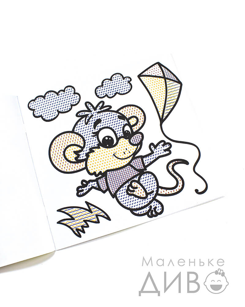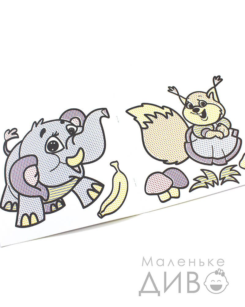 В цих розмальовках з однієї сторони аркуша нанесений малюнок з водною розмальовкою (на папір нанесені крапки з фарбою, які під дією води перетворять картинку на кольорову), інша сторона аркуша пуста (щоб наступний малюнок не ромивався водою з попереднього)