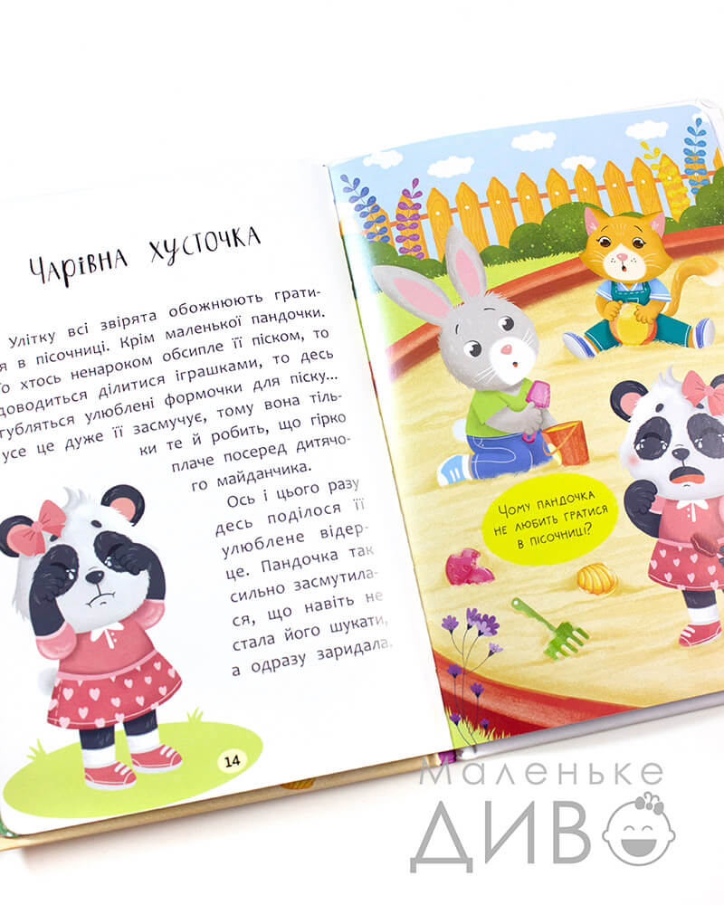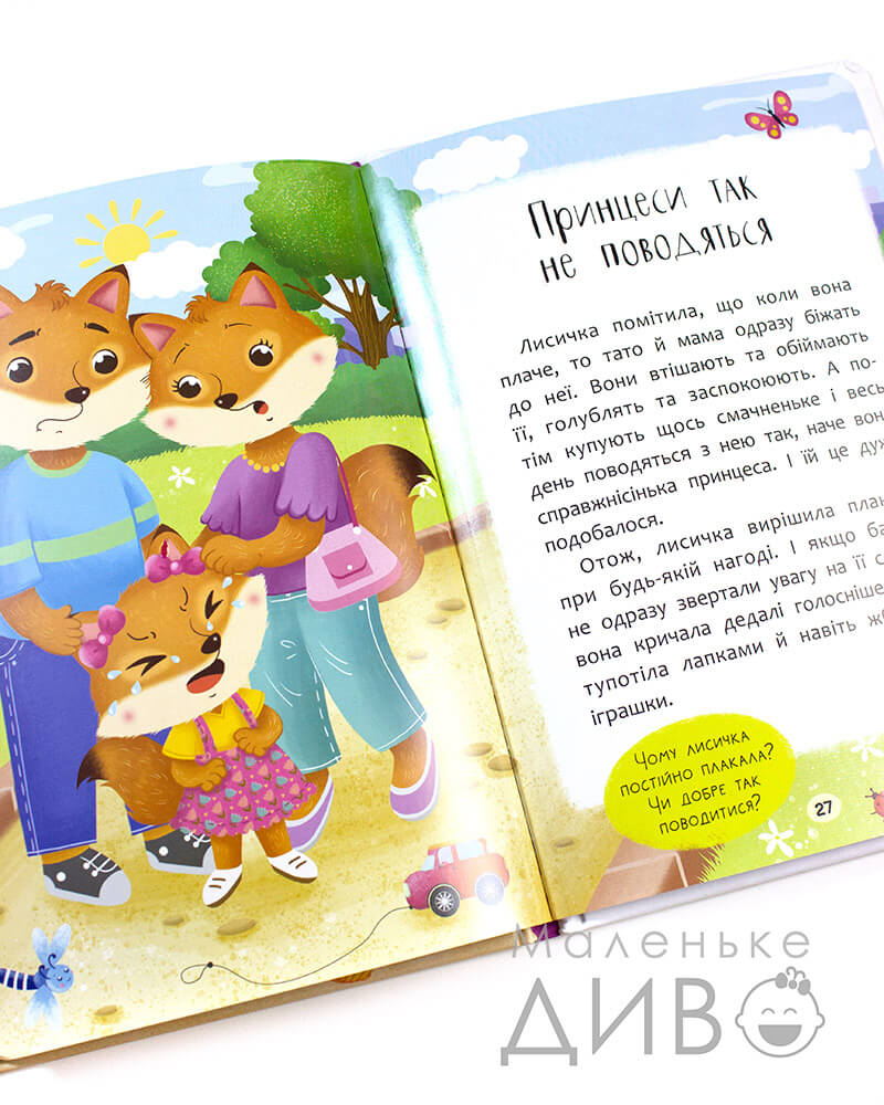 - наповнена п'ятьма чудовими казками, що так чи інакше допоможуть дитині зрозуміти чому плакати та вередувати не варто, а гарний настрій - значно цікавіше, ніж поганий