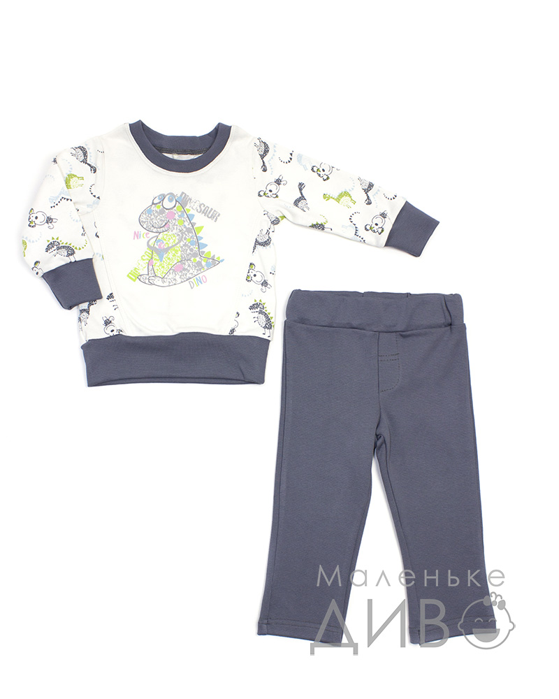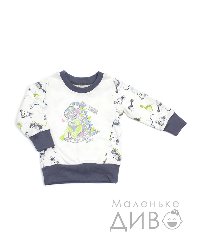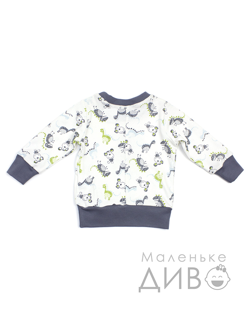 Кофточка (свитер) для мальчика пошита из однотонного трикотажа и трикотажа с орнаментом в виде зверюшек. Манжеты, горловина и низ кофты (свитера) отделаны трикотажем графитового цвета. Спереди на этой кофте (свитере) для мальчика изображен милый динозаврик.