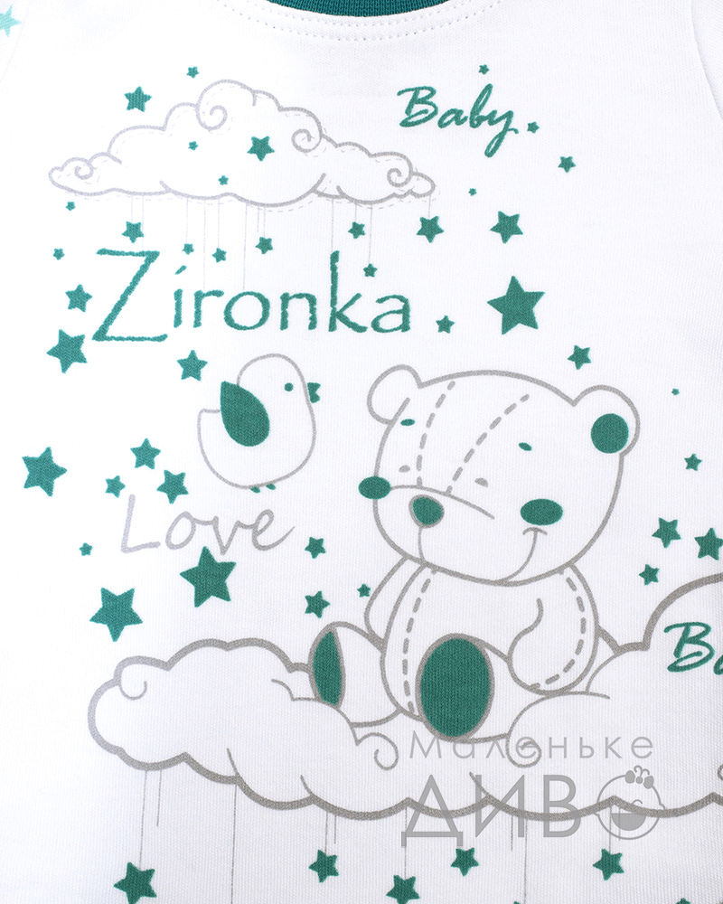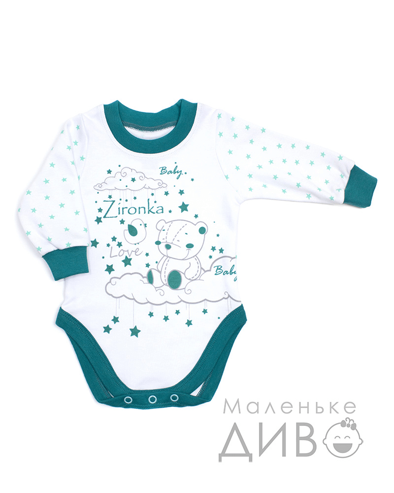 Боди (полукомбинезон) с длинными рукавами для младенца пошит из однотонного трикотажа и трикотажа с орнаментом в виде звездочек. Манжеты, горловина и низ боди (полукомбинезона) отделаны трикотажем насыщенного бирюзового цвета. Спереди на этом боди (полукомбинезоне) изображен милый мишка. Для легкости оодягання этот боди (полукомбинезон) расстегивается между ножками с помощью кнопок.