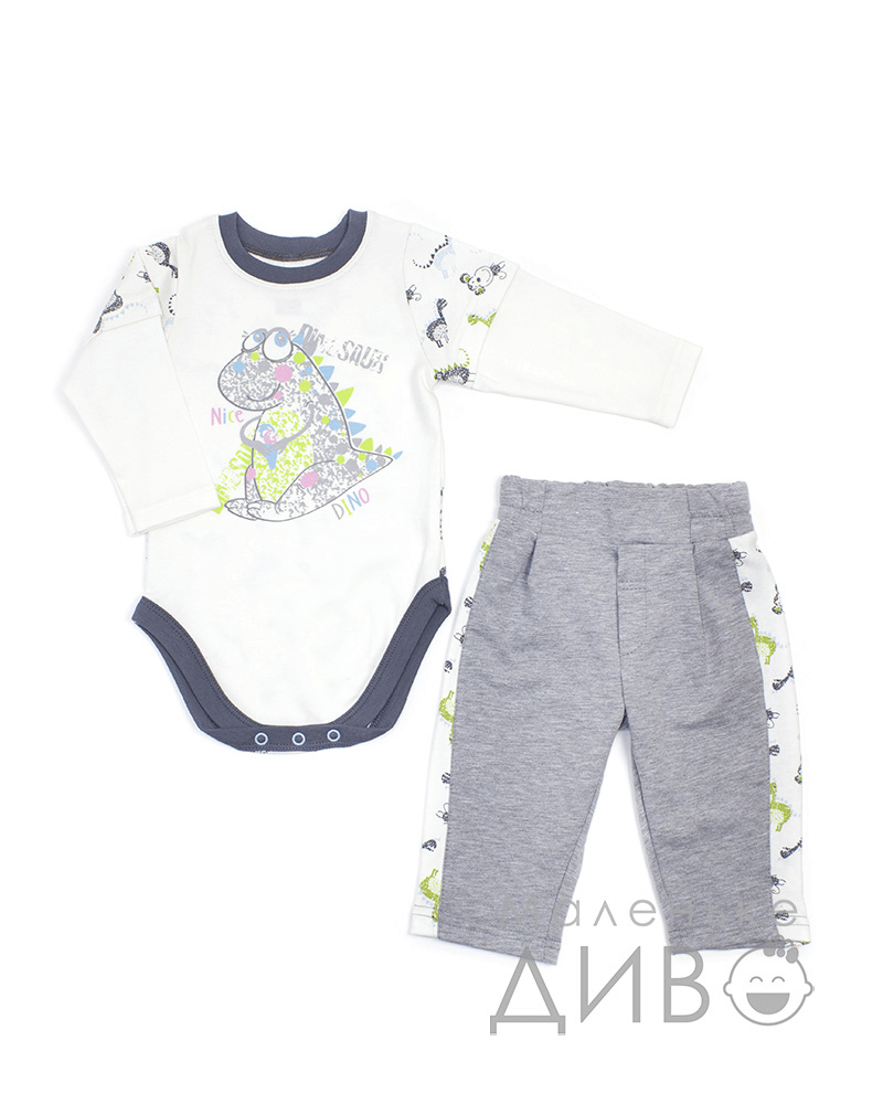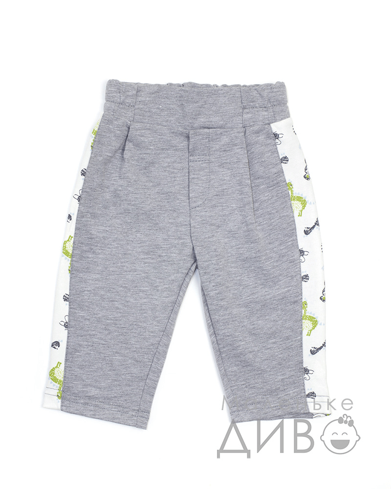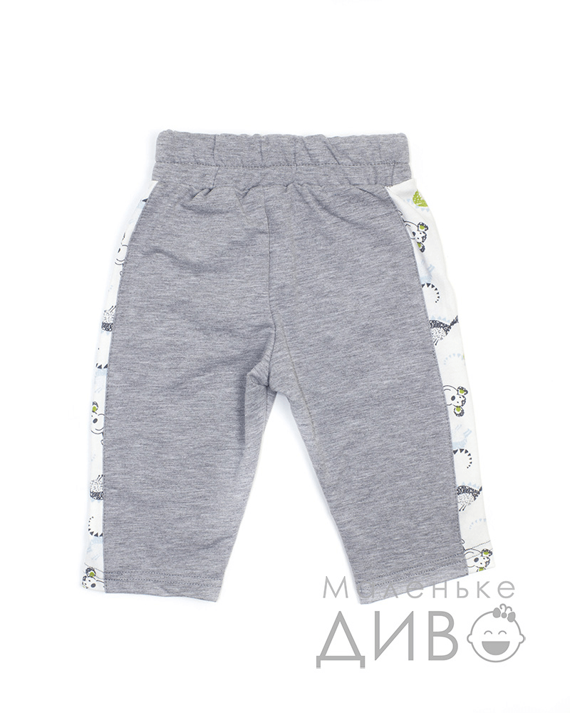 Трикотажные брюки подойдут для прогулок на улице, идеально подходят к боди с артикулом 010230040. Эти штаны (брюки) пошиты из однотонного трикотажа серого цвета и украшенные по бокам вставками из трикотажа с орнаментом в виде животных. Штанишки держатся на широкой резинке.