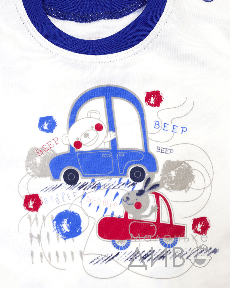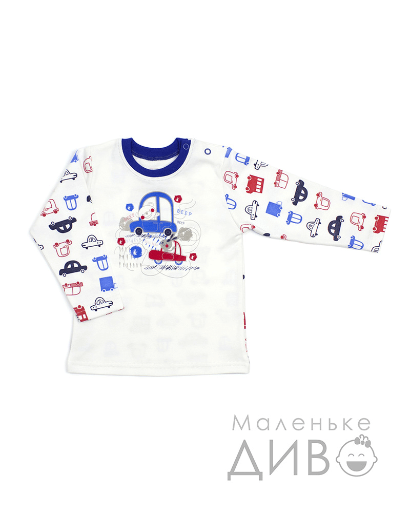Кофточка (свитер) для мальчика пошита из однотонного трикотажа и трикотажа с орнаментом в виде машинок. Спереди на этой кофте (свитере) для мальчика изображен автомобиль. Для легкости одевания на плечи этой кофты (свитера) расположены две кнопки.